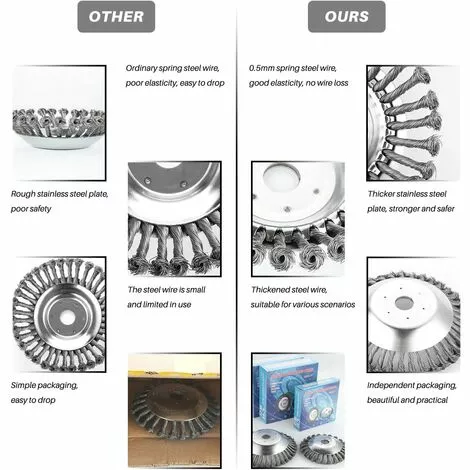 Matériau de haute qualité : le désherbeur est fabriqué en fil d’acier de haute qualité, qui est durable. Dureté élevée, plus durable. Les fils brossés et noués sont étroitement maintenus ensemble, et cette construction offre efficacement des résultats à fort impact qui dépassent les attentes. Le treillis métallique de haute qualité ne s’use pas de manière significative, même en cas d’utilisation intensive de la débroussailleuse pendant de longues périodes.